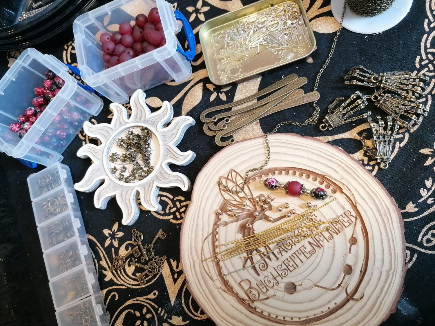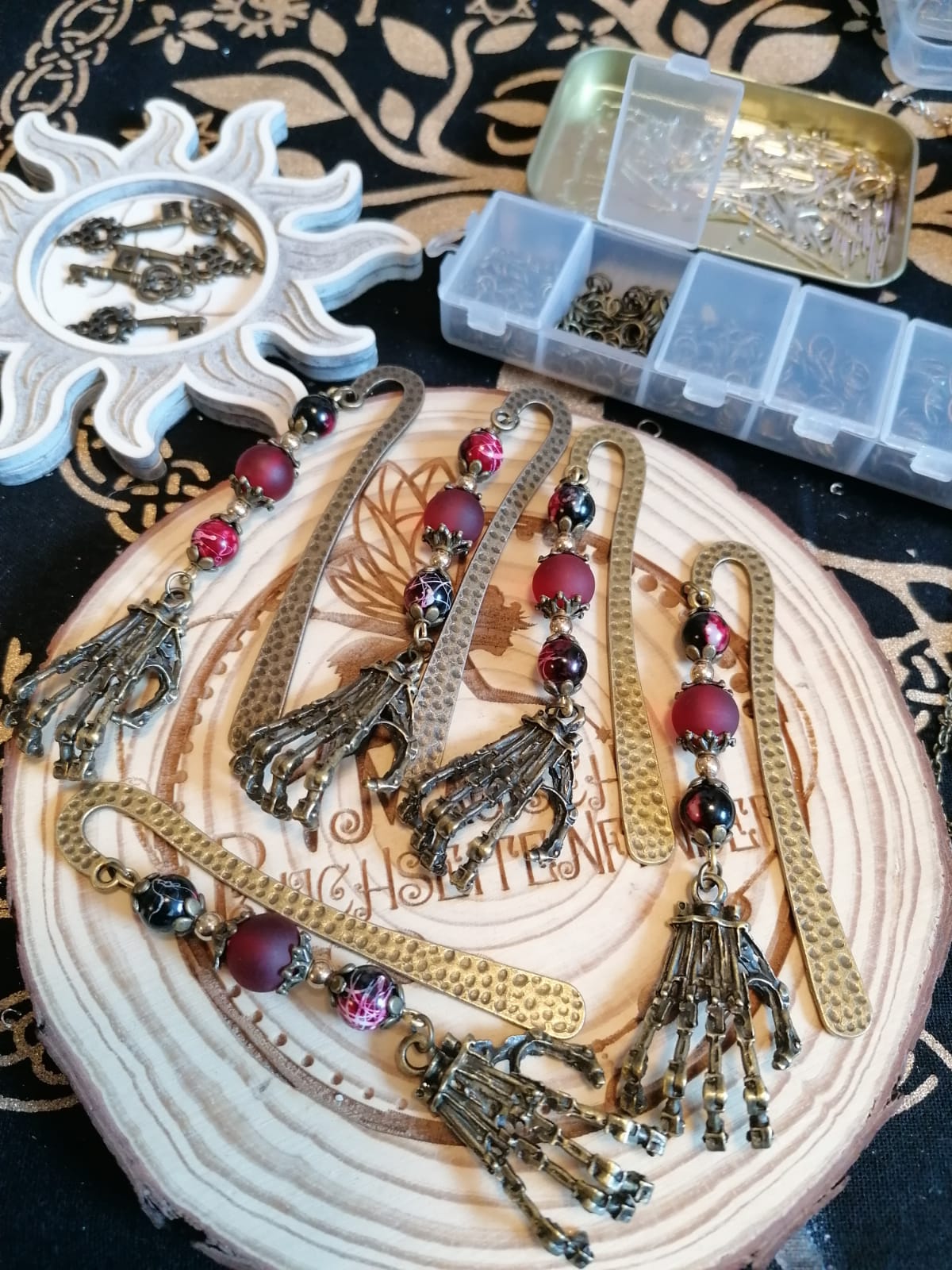 Die eigentliche Herstellung ist ein zeitaufwändiger Prozess, bei dem viel Wert auf Detailarbeit gelegt wird. Ich beginne mit dem Sortieren der metallischen Rohlinge und wähle die passenden Perlen und Anhänger, die später das Lesezeichen zieren sollen. Jedes Element wird mit großer Sorgfalt platziert und befestigt, um ein harmonisches Gesamtbild zu schaffen. Die Anhänger wie der Schlüssel erinnern an versteckte Schätze und verlorene Geheimnisse auf dem Grund des Ozeans.
